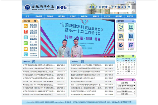 新版网站首页在外观设计上,采用简约风格,以“新华蓝”为主色调,以彩色的栏目标题、图标为点缀,采用了国内诸多高校流行的首屏大图片设计风格,以大图展示的方式宣传学校、教务处的重要活动,使师生能够更加快捷地捕捉到相关信息。在功能设计上,调整了部分原有布局,设置了“系统入口”这一栏目,将学生和教师常用的功能进行整合,以方便广大师生查询和使用。