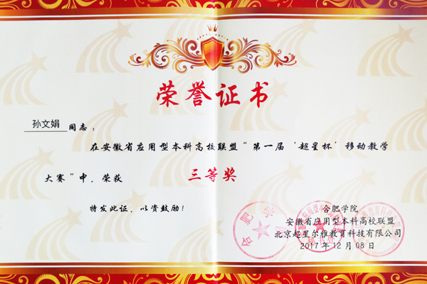 本网讯(通讯员:张贝贝)近日,安徽省应用型本科高校联盟第一届移动教学大赛决赛结果揭晓,威尼斯官网药学院教师黄茸茸、陆松侠共同荣获二等奖,文化与新闻传播学院教师洪玉、信息工程学院教师孙文娟分别荣获三等奖。