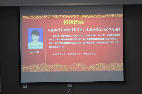 教授黄川、曹军、范东生分别为获奖教师颁奖。获得“科研标兵”荣誉称号的教师金怀梅代表获奖教职工发言,她首先回顾了自己在外国语学院的工作历程,并分享了自己在科研工作上的经验,表达了对外国语学院的感谢,并鼓励全体教职工认真工作,刻苦钻研,投入更多的时间和精力,在新的一年里取得更大的成绩。