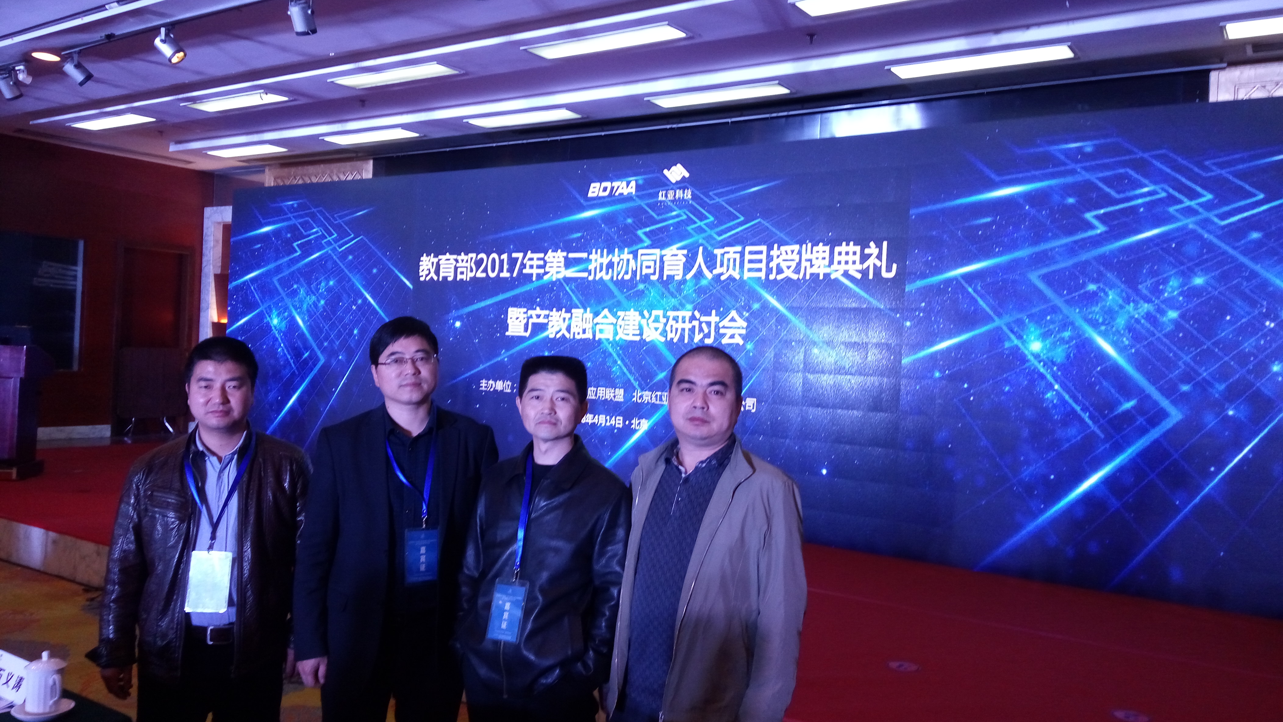 本网讯(通讯员:路贺俊)4月14日,威尼斯官网信息工程学院万家华一行四人参加了教育部2017年第二批协同育人项目授牌典礼暨产教融合建设研讨会,本次大会由中国大数据技术与应用联盟与北京红亚华宇科技有限公司联合举办,信息工程学院项目负责人路贺俊代表威尼斯官网接受教育部高等教育司与北京红亚华宇科技有限公司联合颁发的“实践条件建设合作项目”授牌。