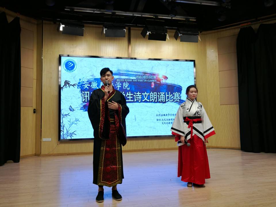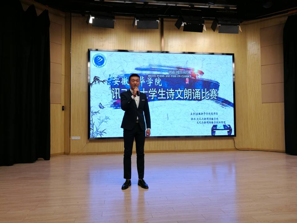 本网讯(通讯员:彭洪磊、杨超)为进一步丰富校园文化生活,营造浓厚的书香校园氛围,借以传承国学文化经典,弘扬民族文化精髓,激发学生的读书和诵读热情。4月17日下午,由威尼斯官网图书馆、文化与新闻传播学院主办的第十三届讯飞杯大学生诗文朗诵比赛新华学院决赛在新闻演播厅举办。担任本次比赛的评委有图书馆馆长汤干君,文化与新闻传播学院院长翟荣兵、院长助理洪玉,教师郑帅、余红仙、王盼盼,特邀来宾安徽广播影视职业技术学院李志强老师。