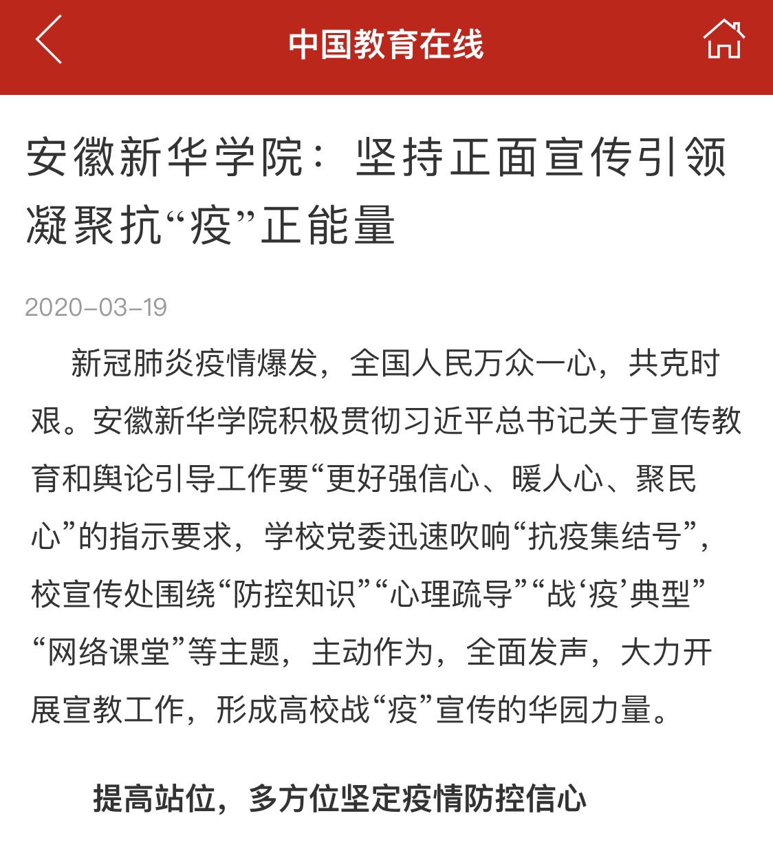 发布《致华园学生、家长的一封信》《安徽省教育工委、教育厅致全省教师的一封信》《教育部致全国大学生的一封信》等,在政策宣传中进一步引导全校党员干部和全体师生增强“四个意识”、坚定“四个自信”、做到“两个维护”,引导师生员工增强责任意识和防护意识,不信谣、不传谣、不造谣,营造良好校园防控疫情氛围。