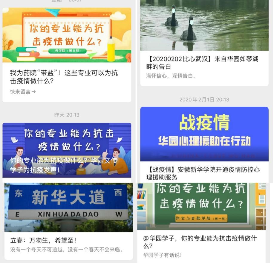 聚焦疫情防控,校宣传处采取“中央厨房”的方式,充分运用官方微信、微博、抖音等新媒体开展新闻宣传和舆论引导。在官方网站上设置了“众志成城、共克时艰”特别专题,在微信公众平台相继推出“战疫情”“青春抗疫”等专题栏目;创意短视频《立春·希望至》《同心战“疫”为武汉加油》,向奋斗在一线的医务工作者致敬;制作创意海报《比心武汉周黑鸭》《@新华人:开学延期,安全不延期》,为疫情防控加油助力;结合学校学科建设情况,通过《你的专业能为抗击疫情做什么?》系列策划,引导广大学子停课不停学……自1月24日安徽省启动重大公共卫生事件一级响应以来,37000cm威尼斯开展了疫情防控系列宣传,学校官方微信推送76篇,阅读量超过30万;校园新闻网发布272条报道稿件;编发各类短视频30条,抖音平台播放量达250万;设计生产各类创意宣传海报70余组。