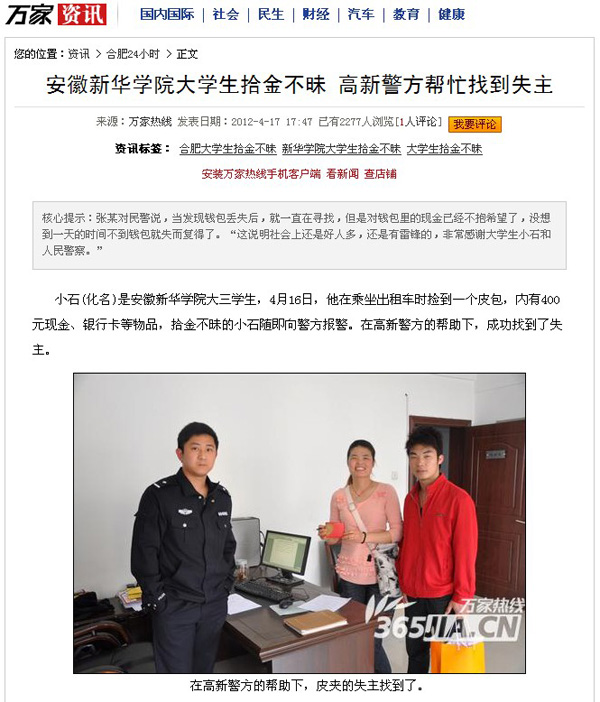 4月17日的万家咨询报道了威尼斯官网大学生在乘坐出租车时捡到了一个钱包,在高新区警方的协助下,成功找到失主。